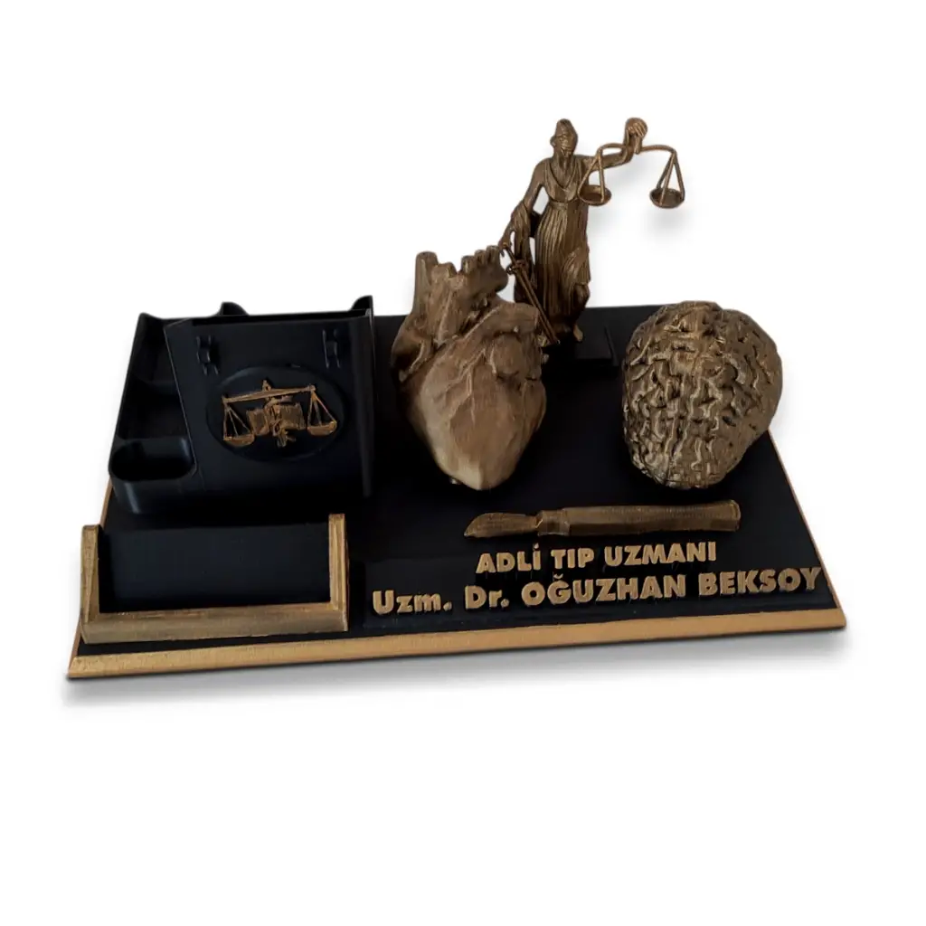 Adli tıp uzmanları için özel olarak tasarlanan bu masaüstü isimlik ve organizer seti, doktor ofislerinde hem düzen hem de estetik bir görünüm sunar.