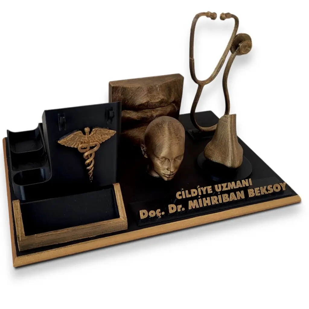 Cildiye uzmanları için özenle tasarlanan kişiye özel masaüstü kalemlik ve kartvizitlik seti, hem estetik hem de işlevselliği bir araya getiriyor. Modern tasarımı ve cilt sağlığı temalı 3D detaylarıyla ofis masanıza profesyonel bir hava katarken, kişiselleştirilebilir isimlik alanıyla size özel bir dokunuş sunuyor.
