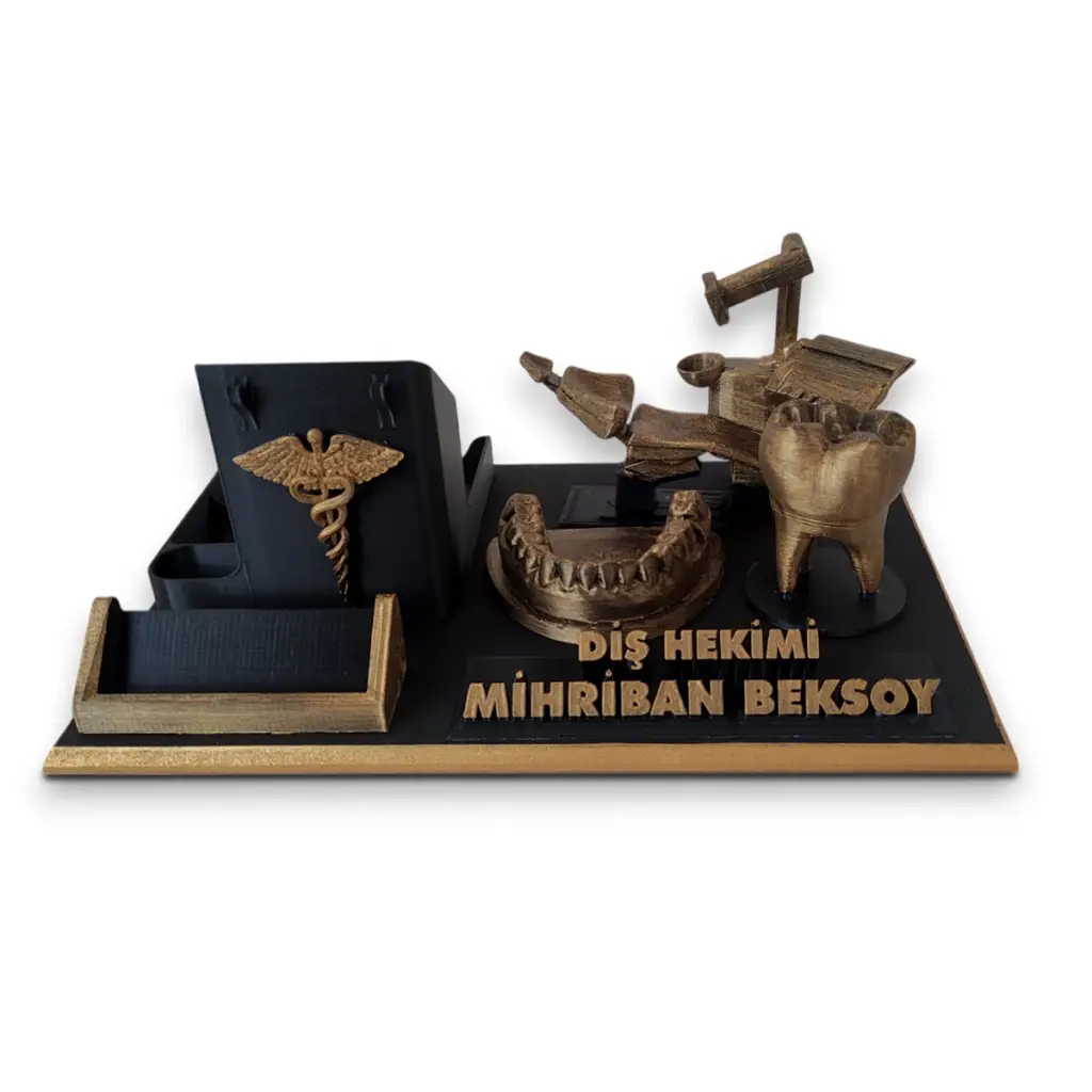 Diş hekimleri için özel olarak tasarlanan bu masaüstü isimlik ve organizer seti, klinik ve ofis masalarında hem düzen hem de estetik bir görünüm sağlar.