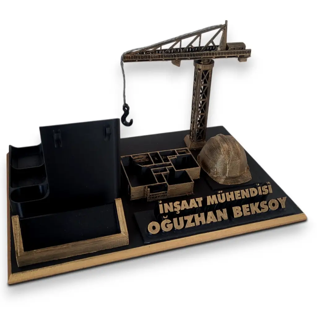 İnşaat mühendisleri için özenle tasarlanan kişiye özel masaüstü kalemlik ve kartvizitlik seti, hem estetik hem de işlevselliği bir araya getiriyor. Modern tasarımı ve inşaat temalı 3D detaylarıyla ofis masanıza profesyonel bir hava katarken, kişiselleştirilebilir isimlik alanıyla size özel bir dokunuş sunuyor.