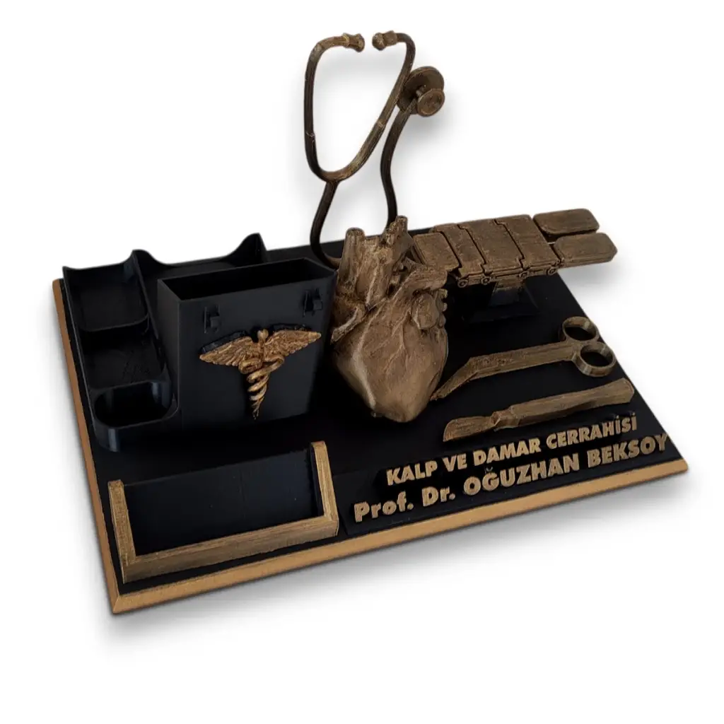 Kalp damar cerrahisi uzmanları için özenle tasarlanan kişiye özel masaüstü kalemlik ve kartvizitlik seti, hem estetik hem de işlevselliği bir araya getiriyor. Modern tasarımı ve kalp damar cerrahisi temalı 3D detaylarıyla ofis masanıza profesyonel bir hava katarken, kişiselleştirilebilir isimlik alanıyla size özel bir dokunuş sunuyor.