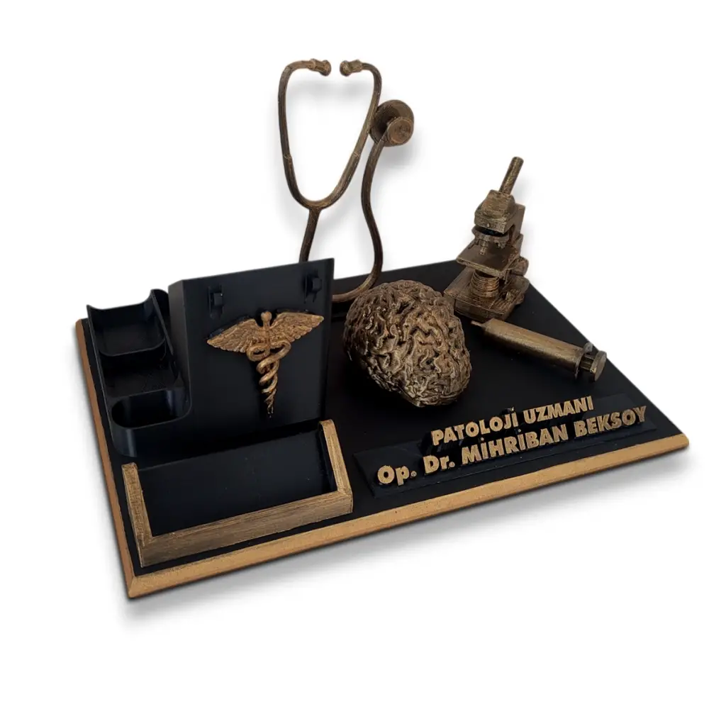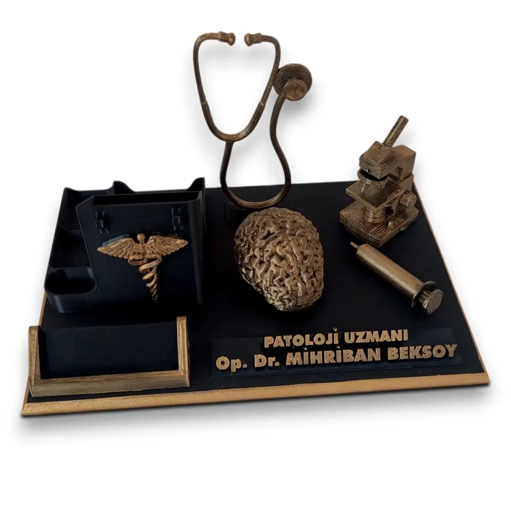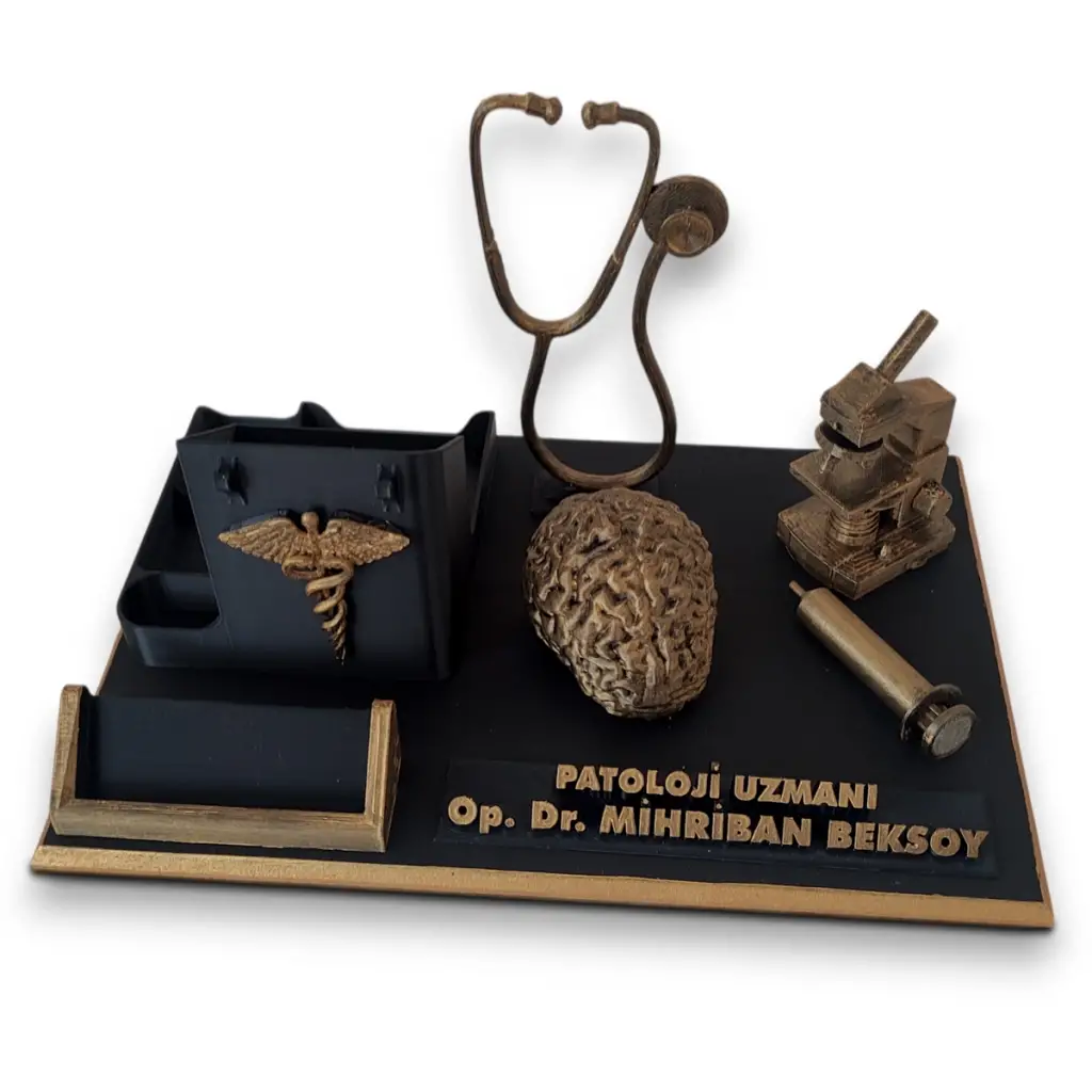 Patoloji uzmanları için özel olarak tasarlanan bu masaüstü isimlik ve organizer seti, ofis masalarında hem düzen hem de estetik bir görünüm sağlar.