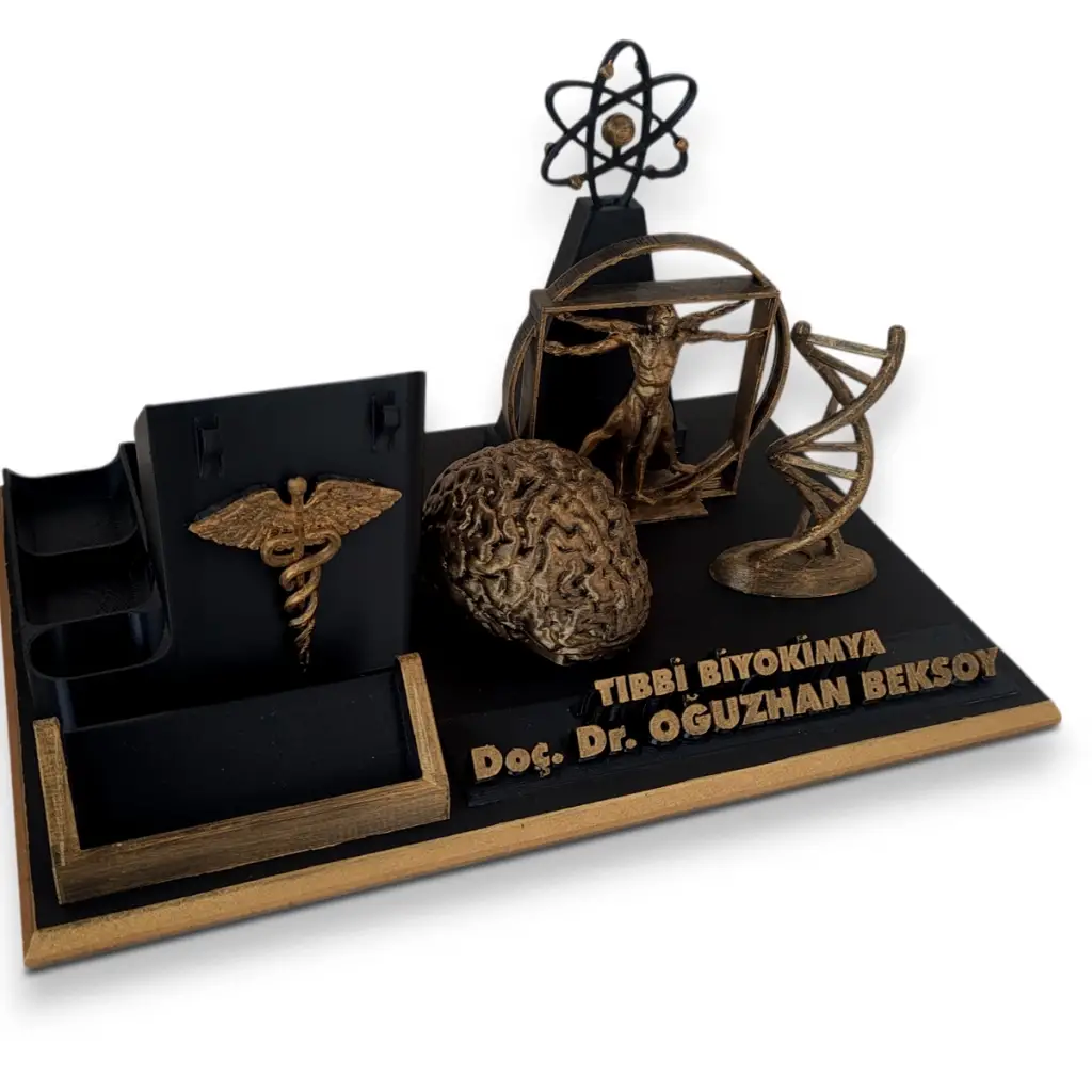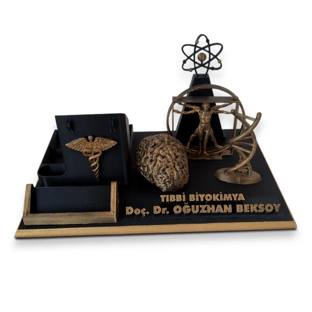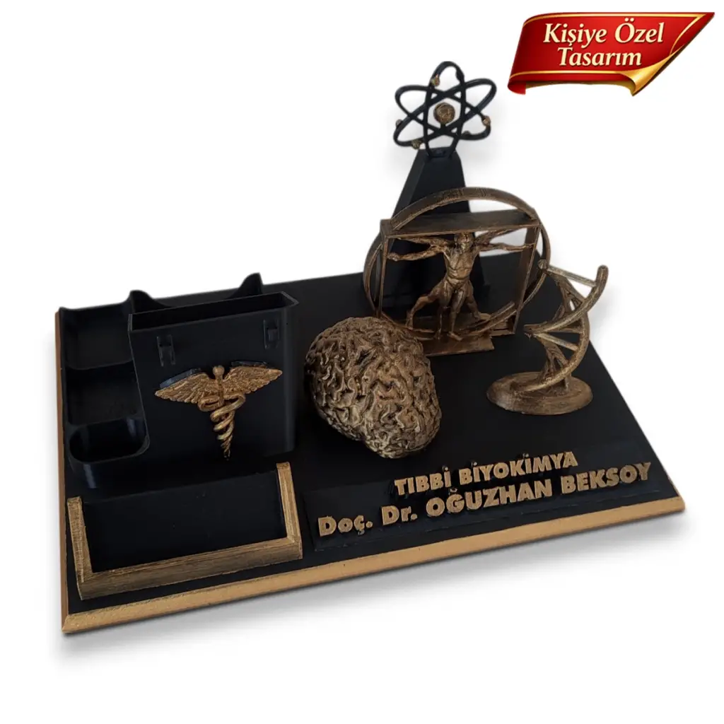 Tıbbi biyokimya uzmanları için özel olarak tasarlanan bu masaüstü isimlik ve organizer seti, ofis masalarında hem düzen hem de estetik bir görünüm sağlar.