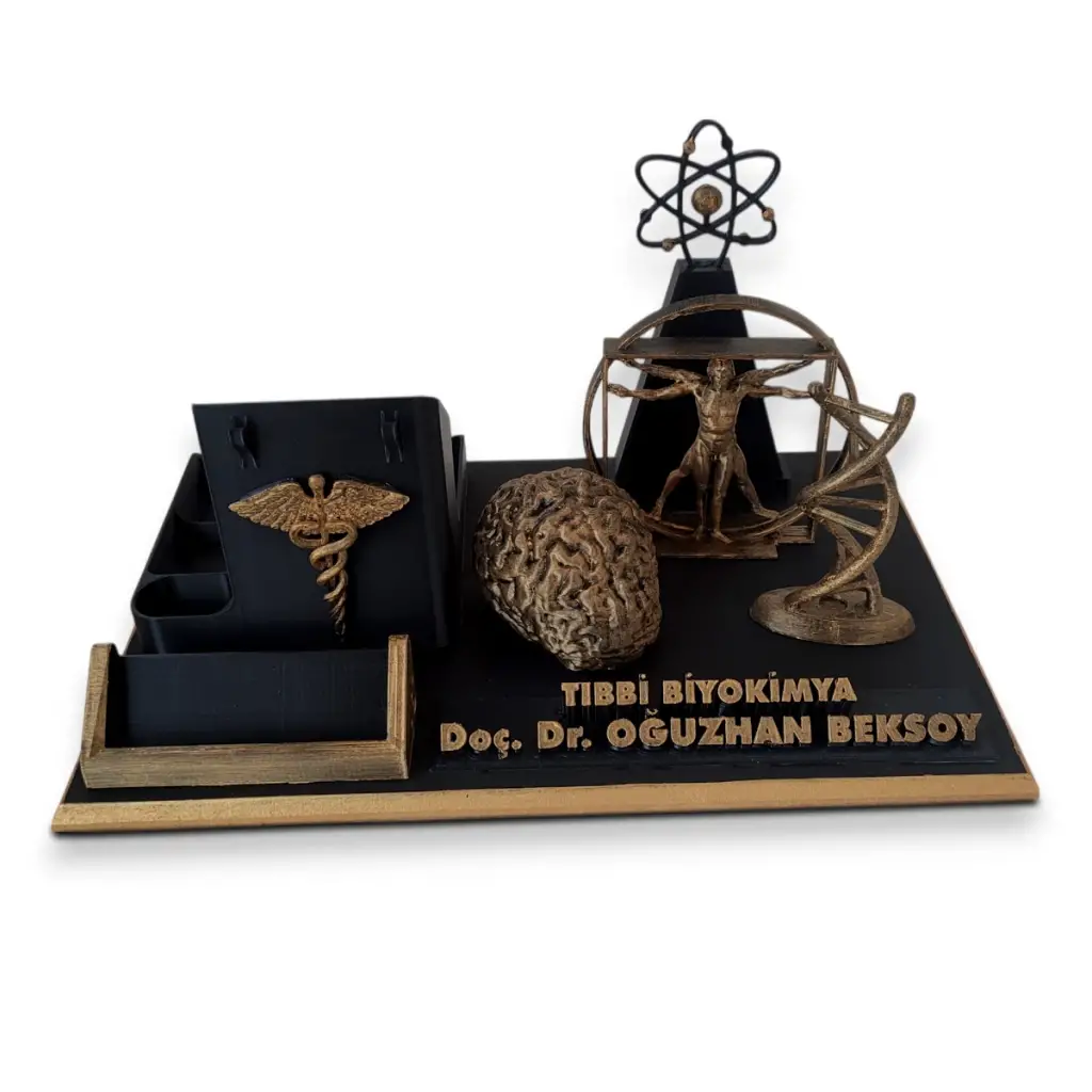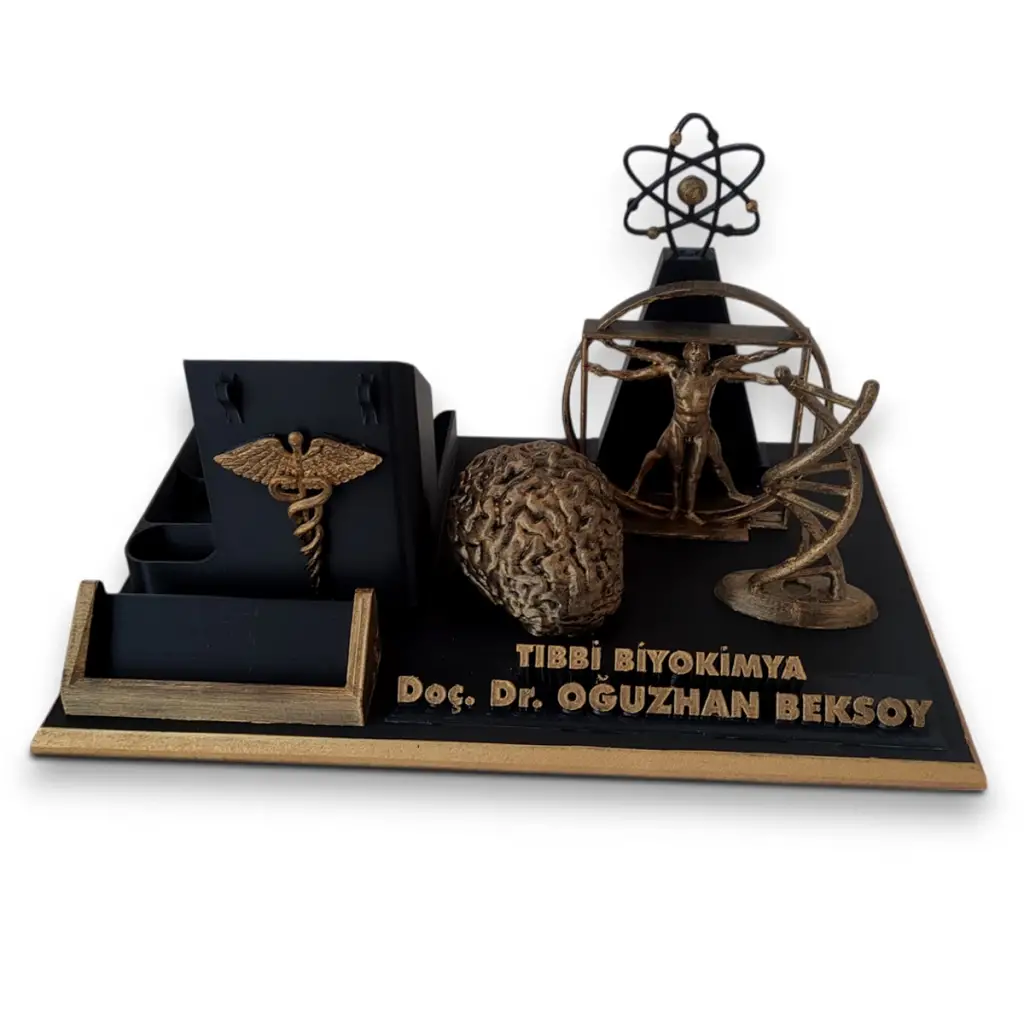 Tıbbi biyokimya uzmanları için özenle tasarlanan kişiye özel masaüstü kalemlik ve kartvizitlik seti, hem estetik hem de işlevselliği bir araya getiriyor. Modern tasarımı ve tıbbi biyokimya temalı 3D detaylarıyla ofis masanıza profesyonel bir hava katarken, kişiselleştirilebilir isimlik alanıyla size özel bir dokunuş sunuyor.